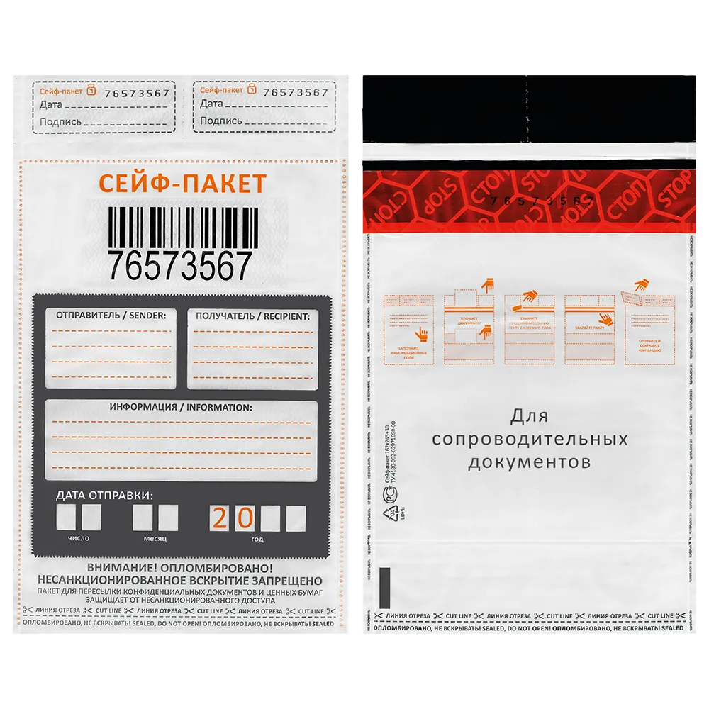 Курьерский пакет изготовлен из непрозрачного влагонепроницаемого трехслойного полиэтилена высокого давления, что обеспечивает дополнительную сохранность посылки. Внешний белый и внутренний черный слои пакета позволяют надежно скрыть его содержимое.