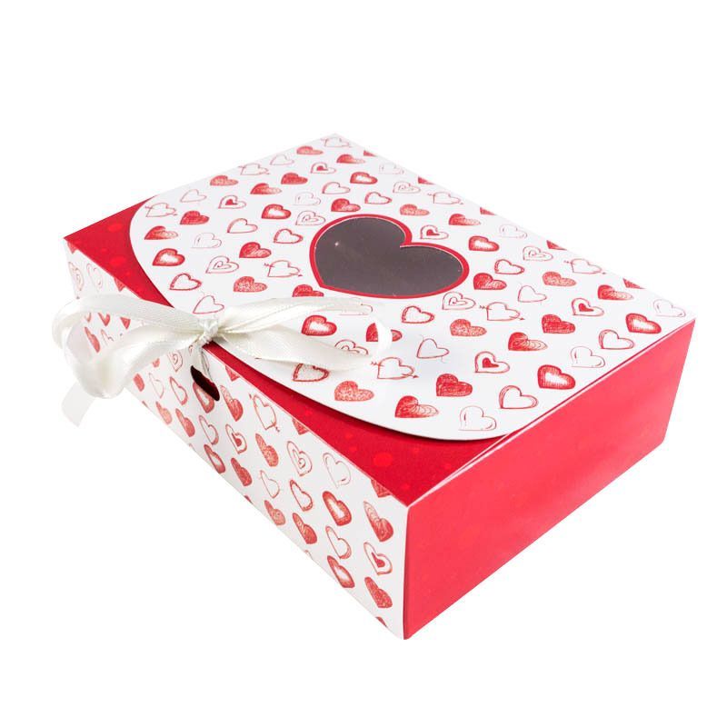 Коробка бумажная Сердца красные с лентой с окном. Используют для упаковки и транспортировки конфет, орехов, шоколада при доставке.
