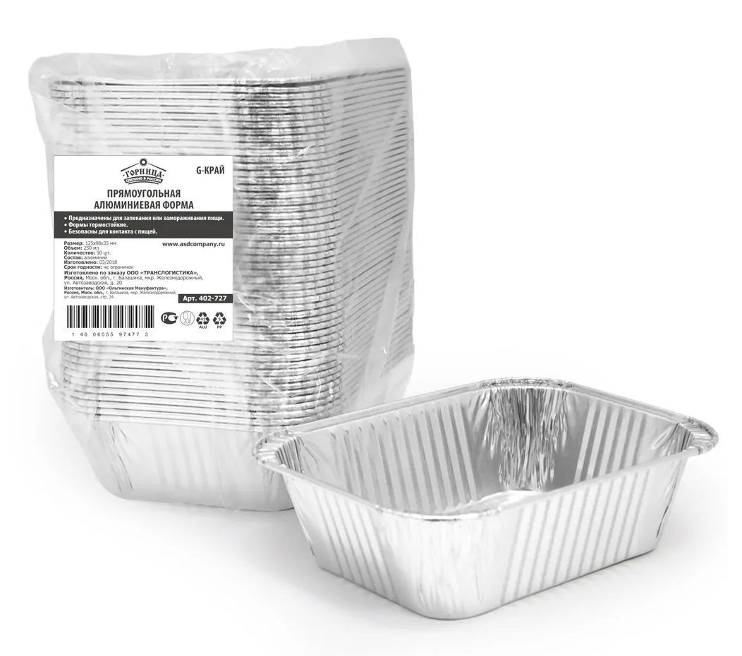 Алюминиевый контейнер  для заморозки, хранения, транспортировки и приготовления продукта. Выдерживает температурный диапазон от -40С до + 280С, подходит для использования в микроволновых печах и духовых шкафах. Размер 125х98 мм, высота 35 мм