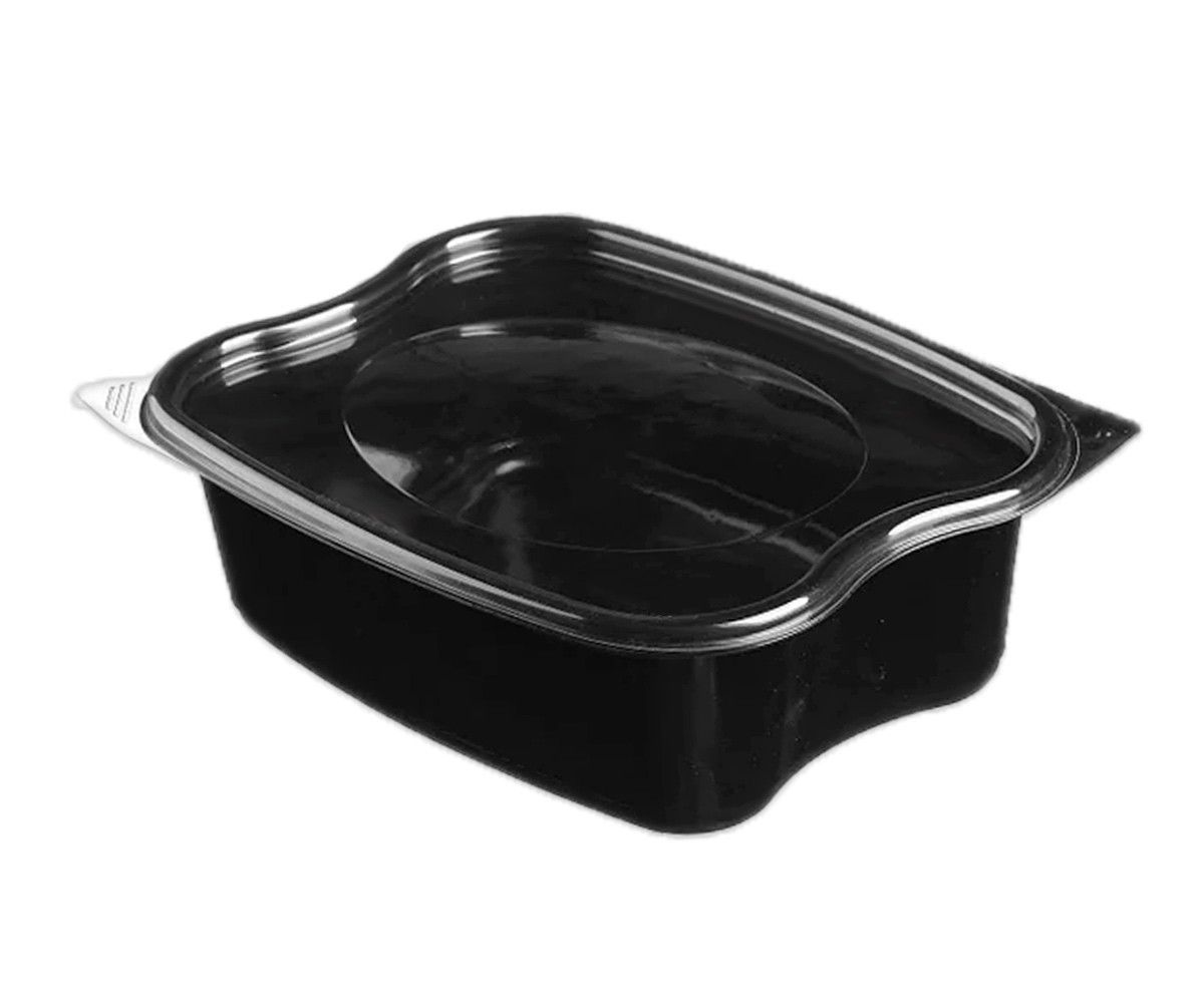Пластиковый двухсекционный одноразовый контейнер с крышкой для фасовки продуктов быстрого питания.