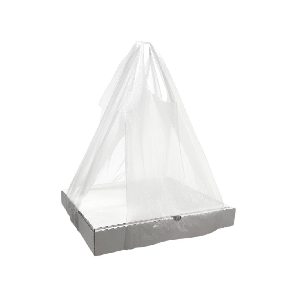 Изготовлены из ПНД. Используются для переноски коробок под пиццу, пирогов, тортов. Благодаря специальным прорезям коробка хорошо встает и не рвет углы, как это бывает у обычных пакетов.