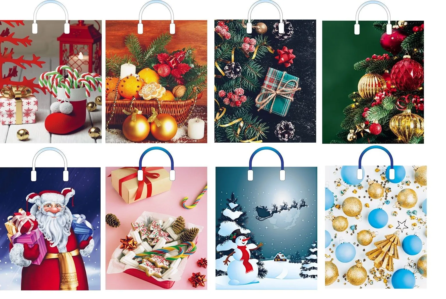 Пакет с прочной петлевой ручкой новогодней символики изготовлен из полиэтилена высокого давления. Пакет имеет гладкую глянцевую поверхность. Подходит для любых сфер использования (парфюмерия, бижутерия и другое), в том числе как подарочный пакет.