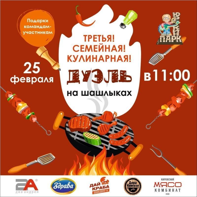 Пятничную рубрику открываем на этот раз очень волнующей для нас новостью: мы выступаем партнерами мероприятия, которое пройдет в ЮРКИН ПАРК | Парк отдыха и развлечений. 25 февраля в 11:00 можно будет посоревноваться в Дуэли на шашлыках! Регистрация уже открыта!
